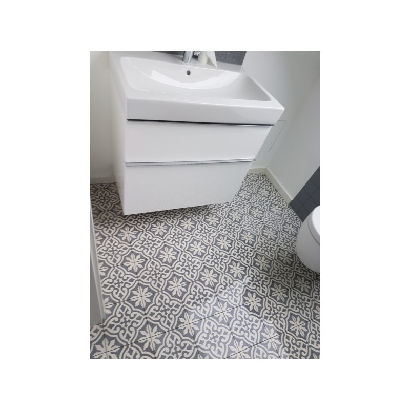 Piękne, marokańskie płytki cementowe 456 w stonowanej kolorystyce. Świetne w nowoczesnych, minimalistycznych wnętrzach. Na podłogi i ściany. Kolory płytki: biel kredowa (M01), szary (M03). Opakowanie: 12 szt (0,48 m2). Format płytki 200x200x16 mm.