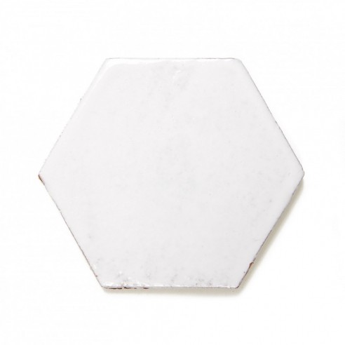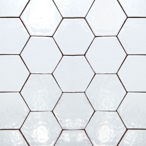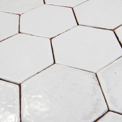 Kolor płytki to błyszcząca, bardzo jasna szarość. Format: sześciokąt ok. 100x115x5 mm, długość boku ok. 55 mm. 1 m2 to ok. 100 - 108 szt. płytek. Format płytek sześciokątnych może różnić się z powodu ręcznej technologii wykonania. Płytki są glazurowane ręcznie, nierówności i "niedoskonałości" powierzchni stanowią o ich urodzie. Płytki stosowane są przeważnie w kuchniach i łazienkach (w tym jako ściany kabin prysznicowych). Płytki te są niezastąpione w kuchniach rustykalnych, ale można je również stosować w nowoczesnych projektach. Naszym zdaniem świetnie sprawdzą się również w łazience.