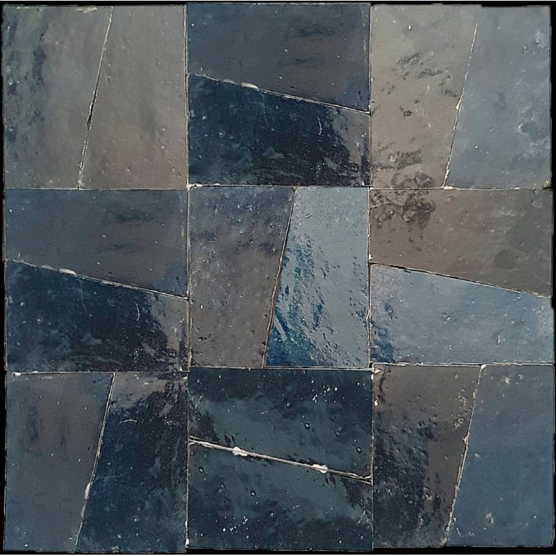 Zellige Bleu Nuit Oblique - oryginalne i tradycyjne, ręcznie wytwarzane marokańskie płytki w nowej odsłonie! Tradycyjne Zellige wykonane we współczesnym kształcie ukośnie przeciętego kwadratu i naklejone na siatkę o formacie ok. 30x30x1 cm. Jest to bardzo wyrafinowane połączenie 100% tradycyjnego rzemiosła marokańskiego wraz z nowoczesną formą geometryczną. W efekcie otrzymasz zróżnicowaną kolorystycznie, bardzo żywą nowoczesną mozaikę ceramiczną!