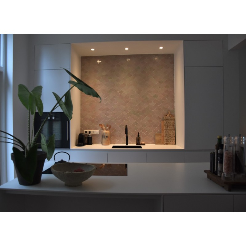 Różowo-szare Płytki Zellige Rybia Łuska - Gris Rose to tradycyjna marokańska formowana ręcznie płytka ścienna o wymiarach ok. 10 x 10 cm lub 5 x 5 cm i grubości ok. 1 cm, pochodząca z fabryki w Fezie w Maroku. Dzięki specyficznej metodzie produkcji płytki są niejednorodne w kolorze i mają bardzo żywą strukturę powierzchni. Chociaż płytka wygląda rustykalnie, doskonale pasuje również do nowoczesnego wnętrza...