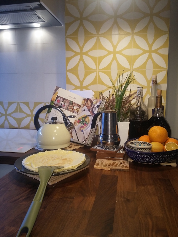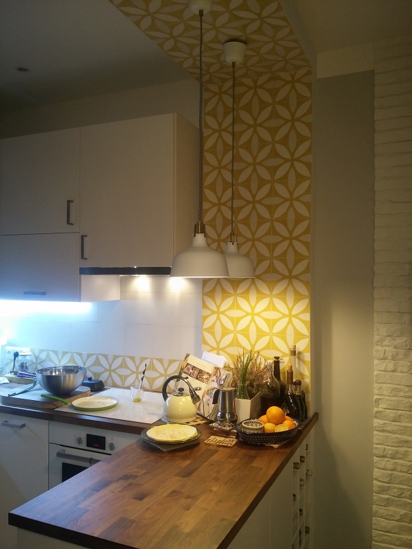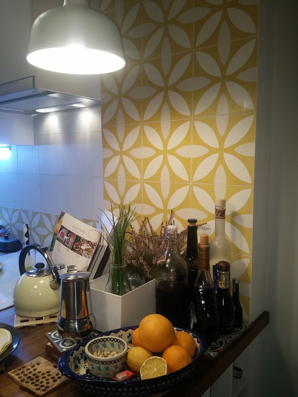 Płytki cementowe 312 w kolejnej już odsłonie! Znowu ściana w kuchni, tym razem także w komplecie z jednobarwną płytką białą M01. Serdecznie dziękujemy naszej Klientce! Kuchnia, Różana-Mokotów, K. Komendarczyk