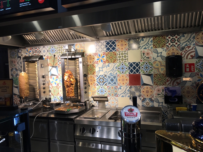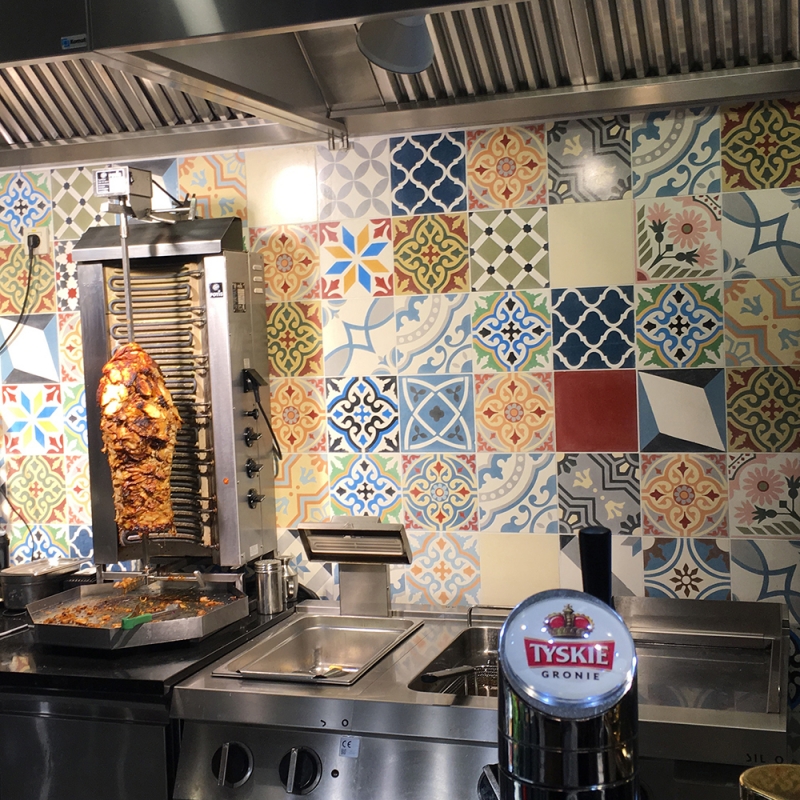Cementowe płytki PATCHWORK w restauracji w Alfa Centrum w Gdańsku przy ul. Kołobrzeskiej.