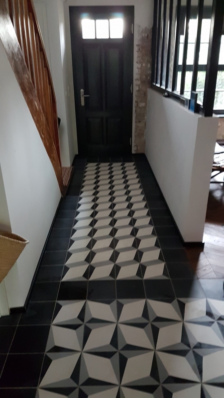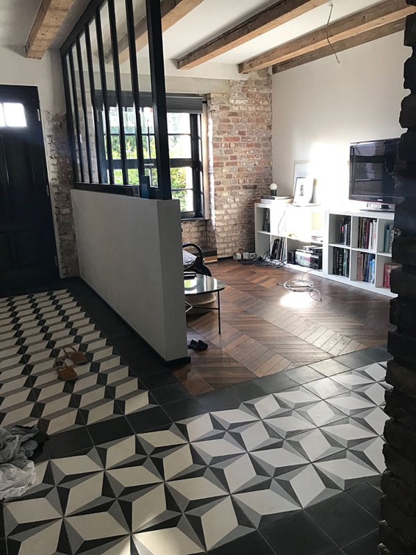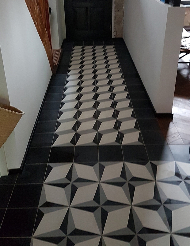 Korytarz wejściowy i płytki cementowe 317 i jednobarwne czarne M07. Zwracamy uwagę, że płytka 317 może być układana na dwa sposoby.