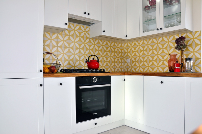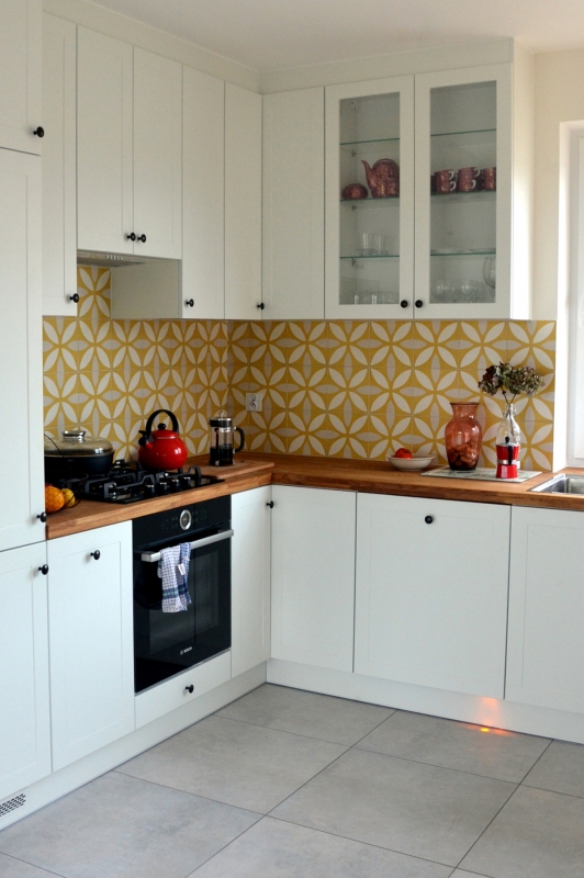 Proste białe fronty i lekkie, wesołe płytki cementowe nr 312. Serdecznie dziękujemy naszej klientce za udostępnienie zdjęć z realizacji.