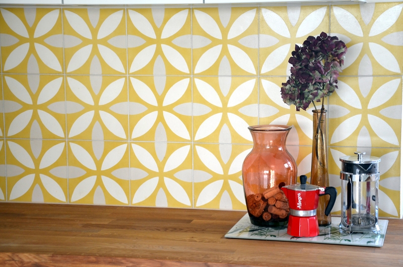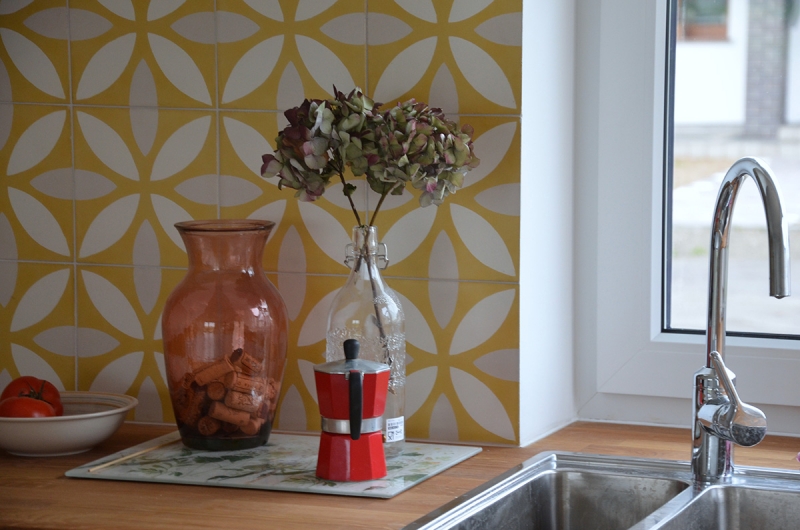 Płytki cementowe 312 na kuchennej ścianie