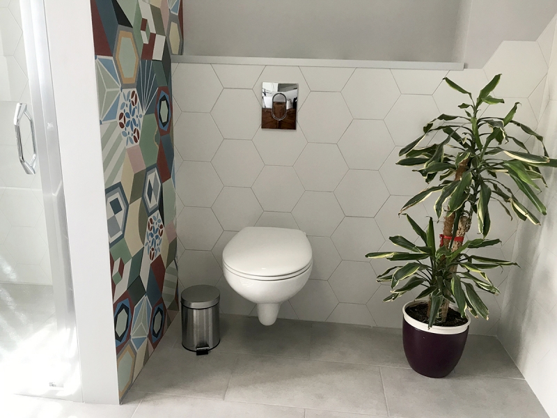 W tej realizacji wykorzystano sześciokątne płytki cementowe w wersji Patchwork. Płytki posłużyły jako okładzina ścianki oddzielającej WC od prysznica. W tej sytuacji nie było potrzeby zastosowania żadnej fugi, płytki ułożono "na styk". Naszym zdaniem świetny efekt!