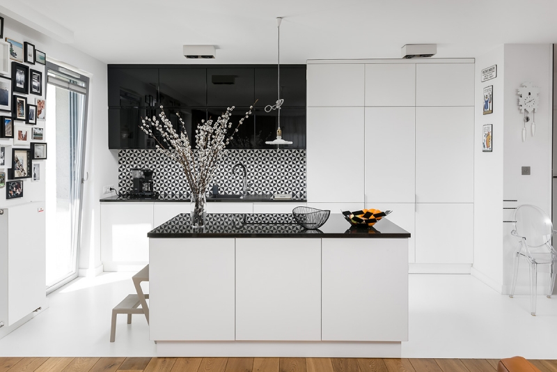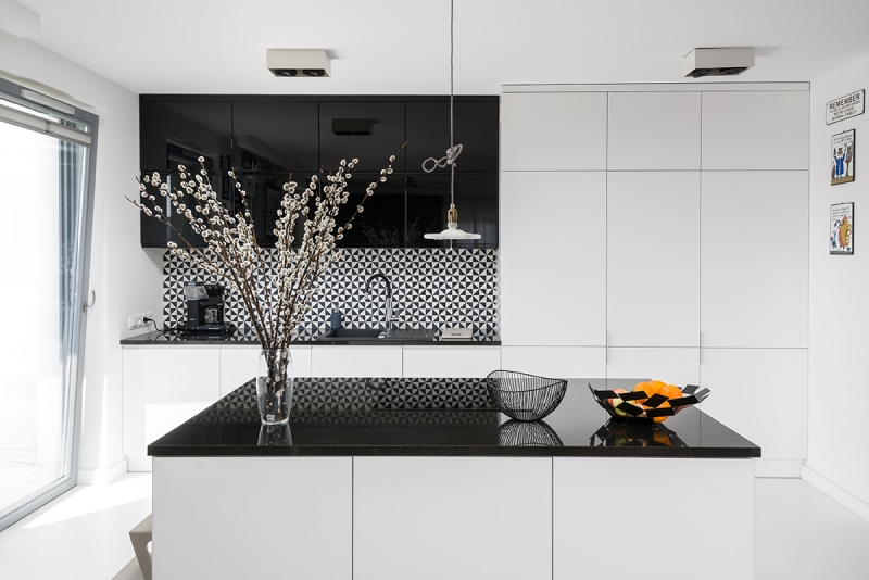 Pomimo, że płytki cementowe są formowanym ręcznie i tradycyjnym materiałem wykończeniowym, to jednak ze względu na ogromną ilość wzorów doskonale sprawdziły się w tej bardzo nowoczesnej, minimalistycznej kuchni. Projekt: TTA studio, Foto: Stanisław Zajączkowski