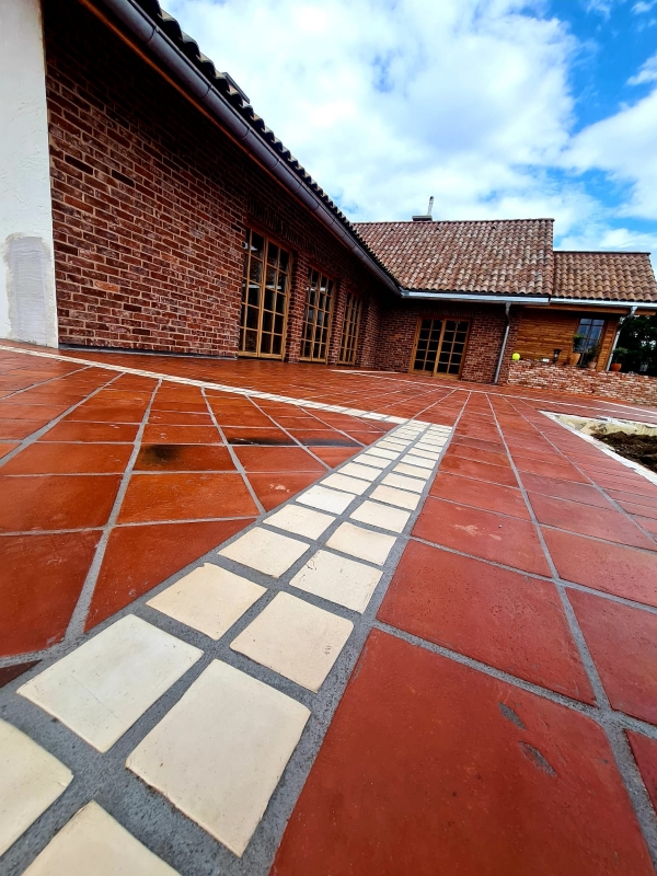 Ręcznie formowana Terakota Gotycka w formacie 20x20 cm została ułożona na odkrytym tarasie. Jako Dekor została wykorzystana płytka w kolorze kremowym w formacie 10x10. Naszym zdaniem efekt jest świetny!