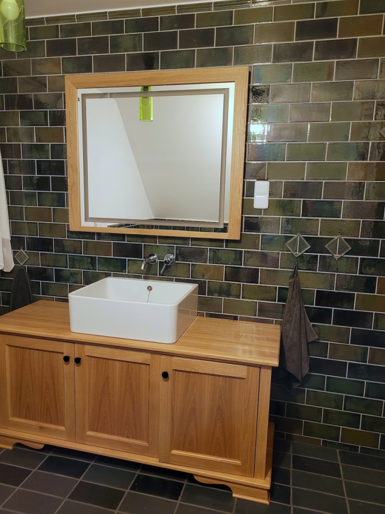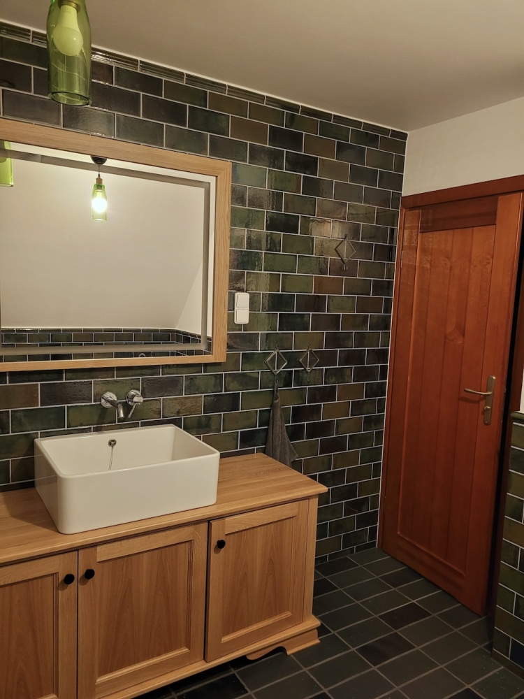 Stylowa łazienka, na ścianie płytki Metro 10x20 w kolorze zieleń butelkowa, wykończenie listwa ozdobna w tym samym kolorze. Na podłodze szkliwiona Terakota Gotycka w formacie 25x12 w kolorze antracyt matowy.