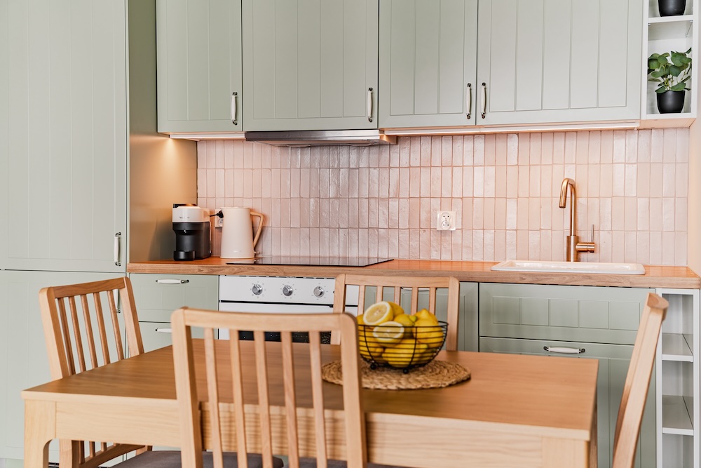 Płytki Azulejo Beige Matt w formacie 14x4,5 znalazły swoje miejsce na kuchennym backsplashu. Prosimy zauważyć, że różowy kolor płytek widoczny na zdjęciach jest wynikiem zastosowanego oświetlenia. Zdjęcia pokazujące prawdziwy kolor płytek znajdą Państwo w galerii produktu.