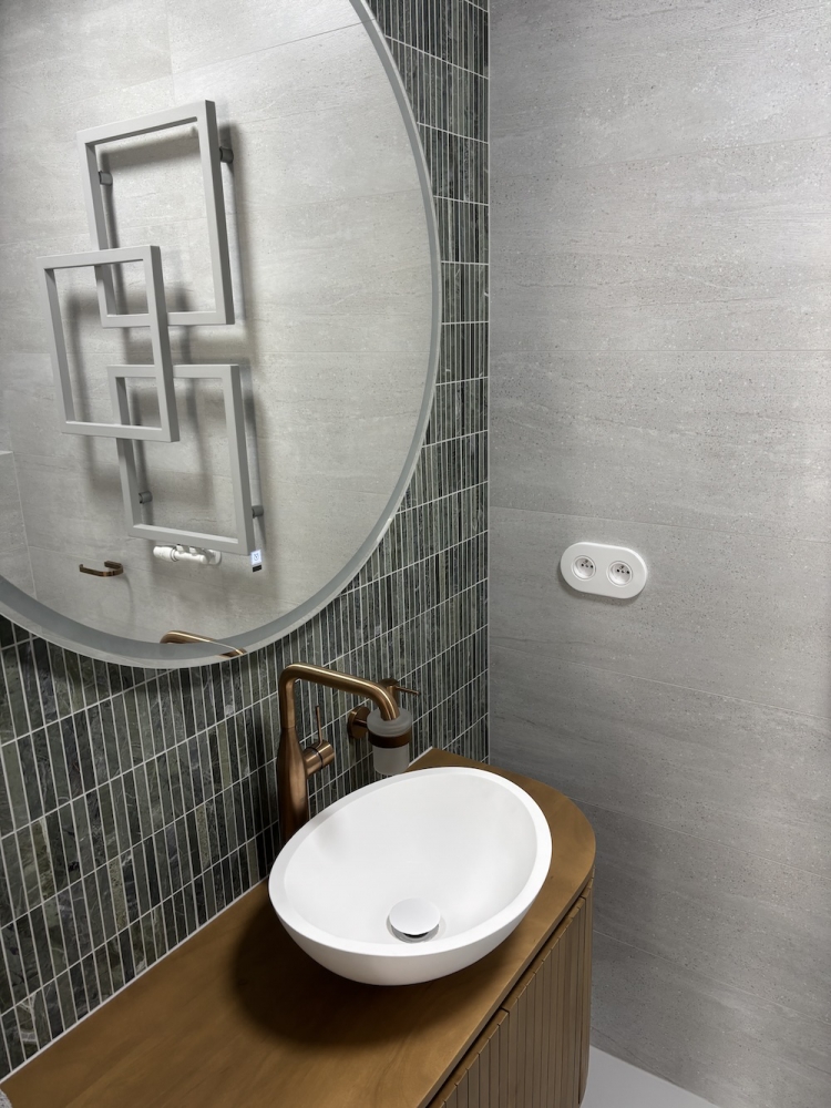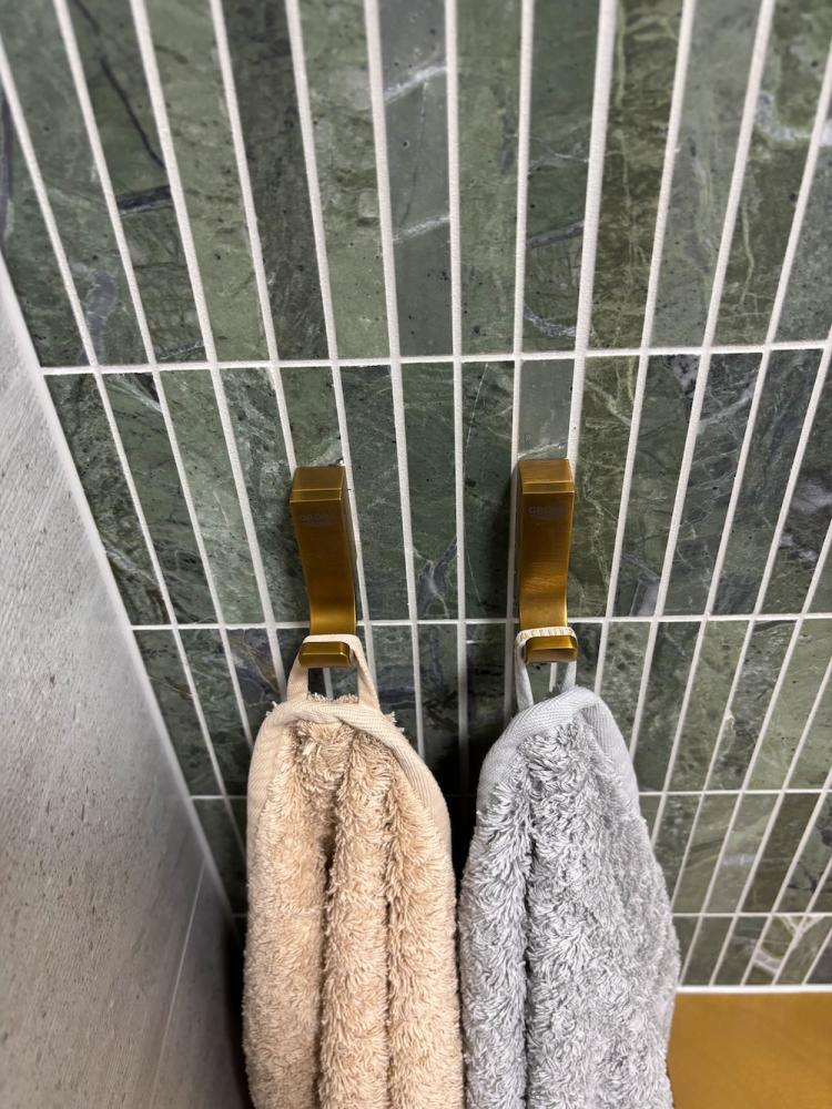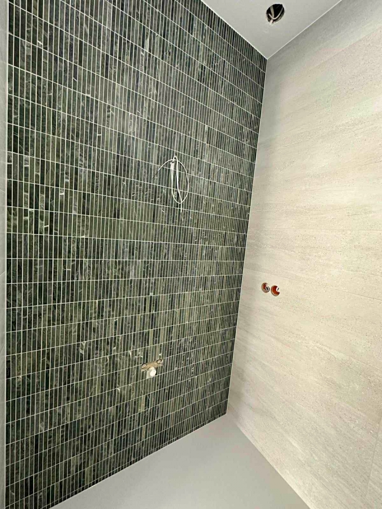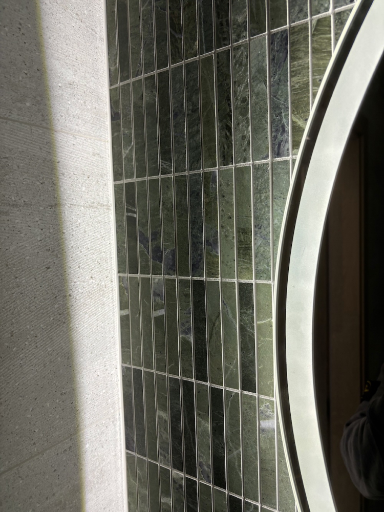 Zielony marmur w łazience w nowoczesnej formie KitKat to połączenie współczesnego wzornictwa z ponadczasowym pięknem naturalnego kamienia. Smukłe, podłużne elementy mozaiki subtelnie wydłużają optycznie przestrzeń, a miękka gra światła na lekko zróżnicowanej powierzchni marmuru dodaje aranżacji głębi i elegancji. Ten zestaw tworzy spójną, harmonijną całość, która równie dobrze sprawdzi się w minimalistycznych wnętrzach, jak i w bardziej wyszukanych projektach. Dziękujemy naszemu Klientowi za udostępnione zdjęcia i serdecznie gratulujemy świetnego efektu.