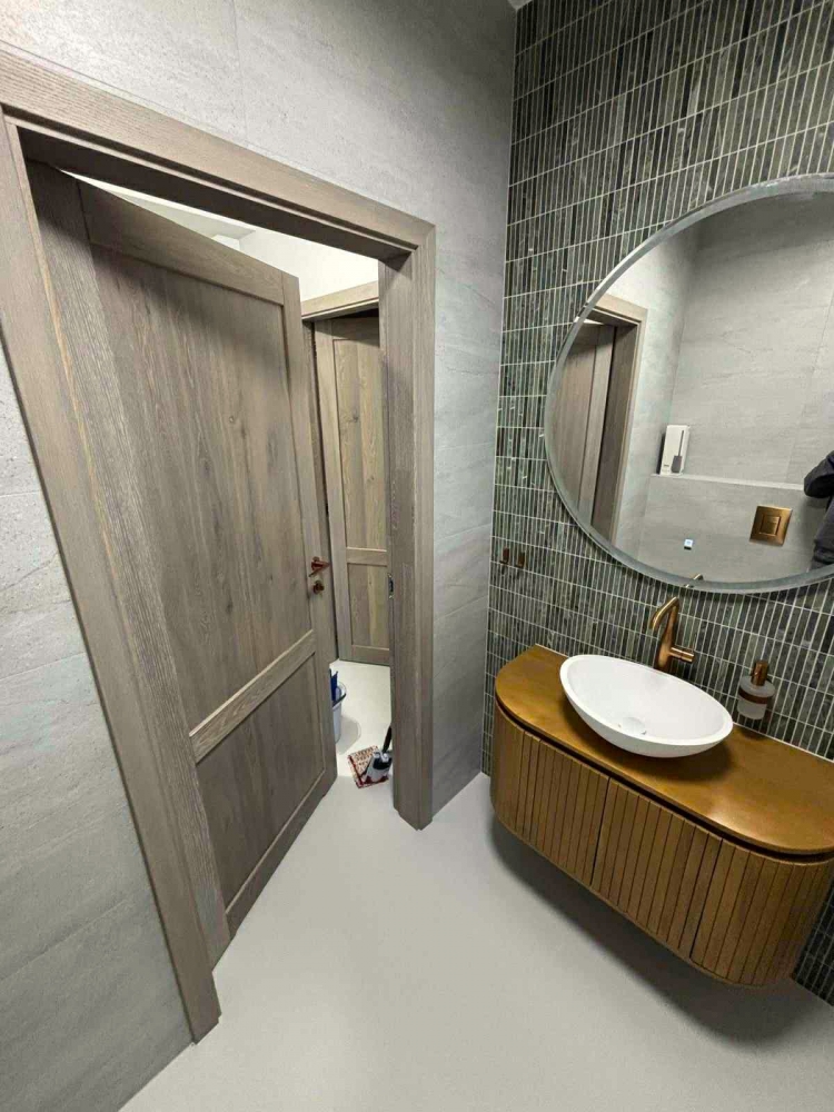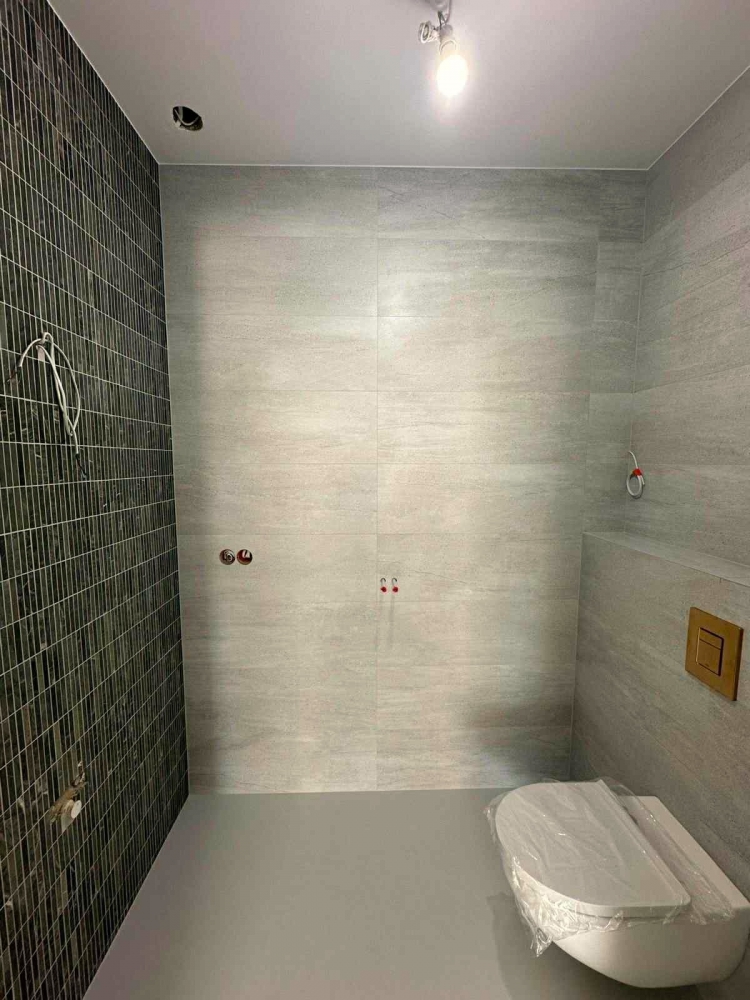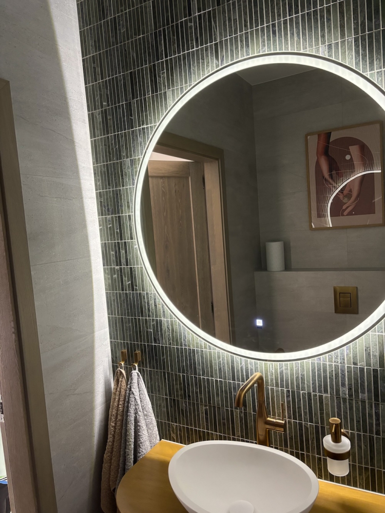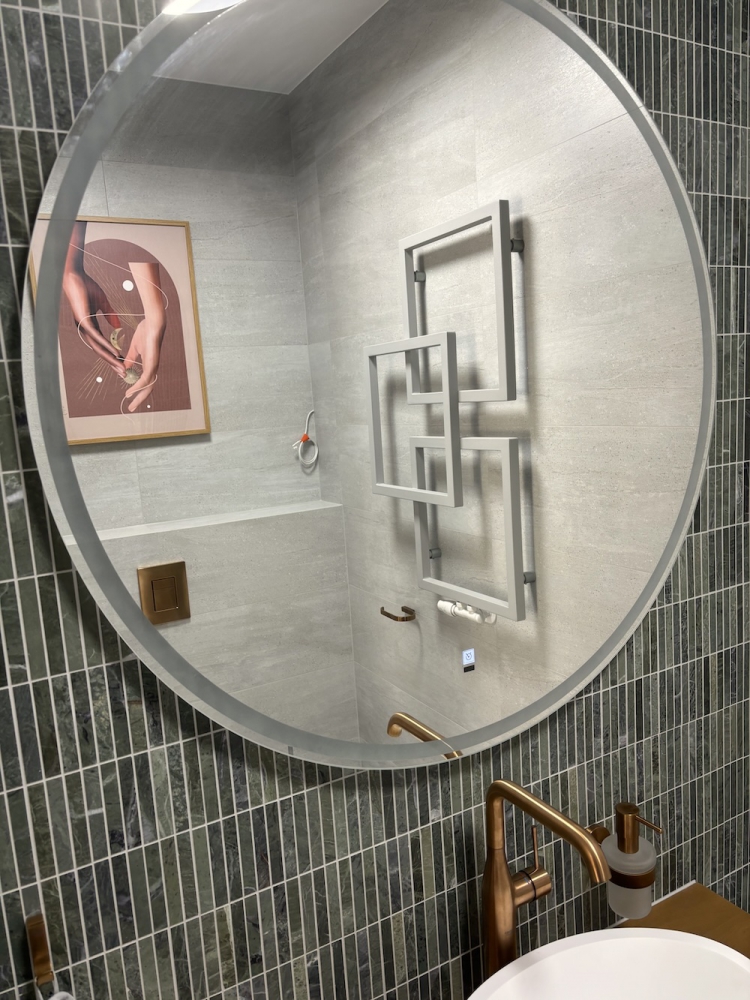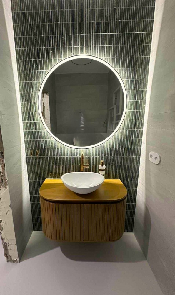 Zielony marmur w łazience w nowoczesnej formie KitKat to połączenie współczesnego wzornictwa z ponadczasowym pięknem naturalnego kamienia. Smukłe, podłużne elementy mozaiki subtelnie wydłużają optycznie przestrzeń, a miękka gra światła na lekko zróżnicowanej powierzchni marmuru dodaje aranżacji głębi i elegancji. Ten zestaw tworzy spójną, harmonijną całość, która równie dobrze sprawdzi się w minimalistycznych wnętrzach, jak i w bardziej wyszukanych projektach. Dziękujemy naszemu Klientowi za udostępnione zdjęcia i serdecznie gratulujemy świetnego efektu.