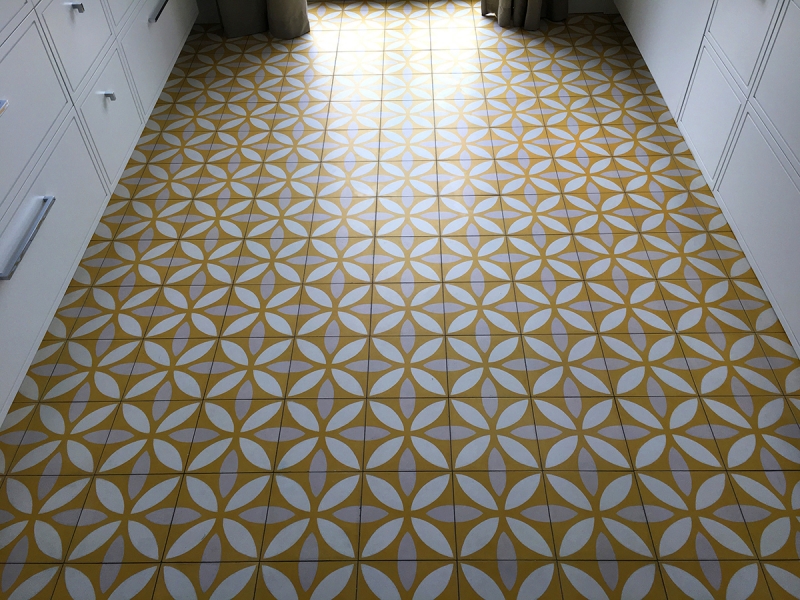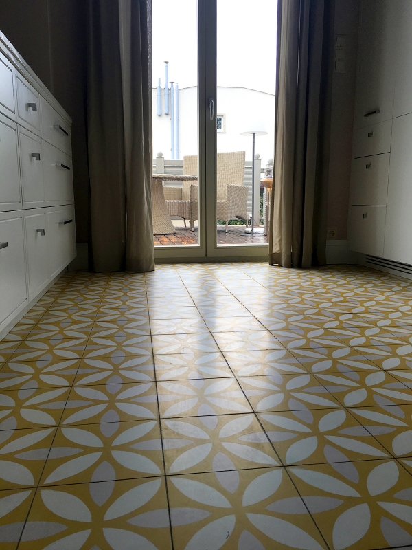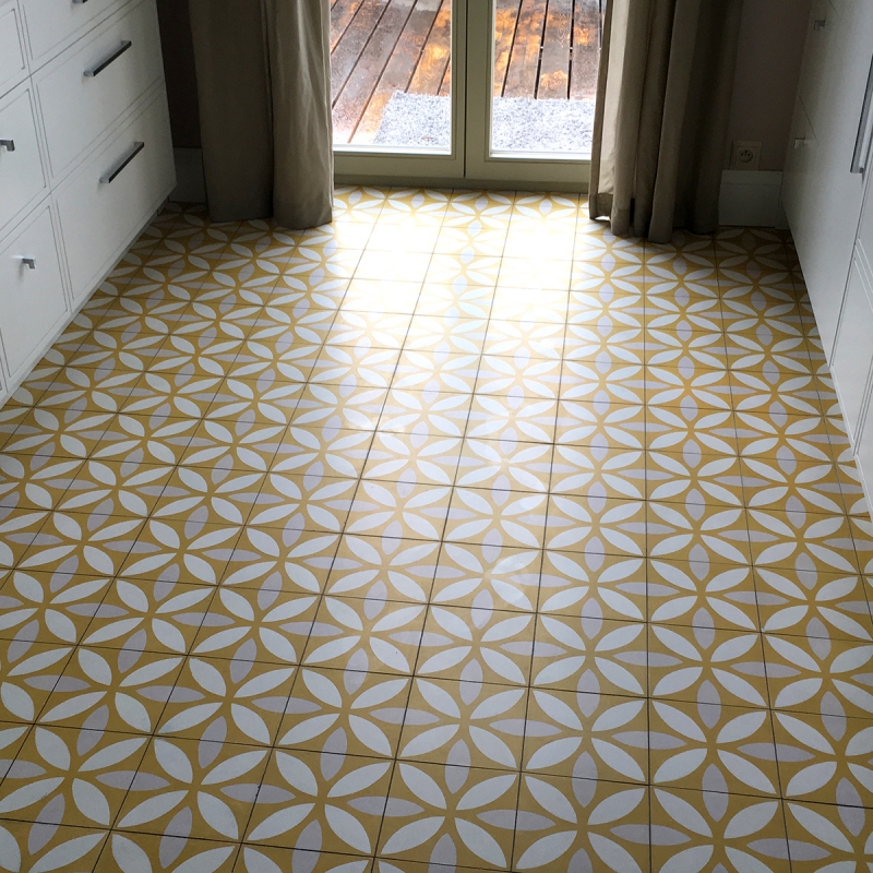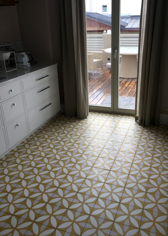 Apartament w Sopockiej kamienicy przy ul. Haffnera. Kafle cementowe nr 312 ułożone w kuchni.