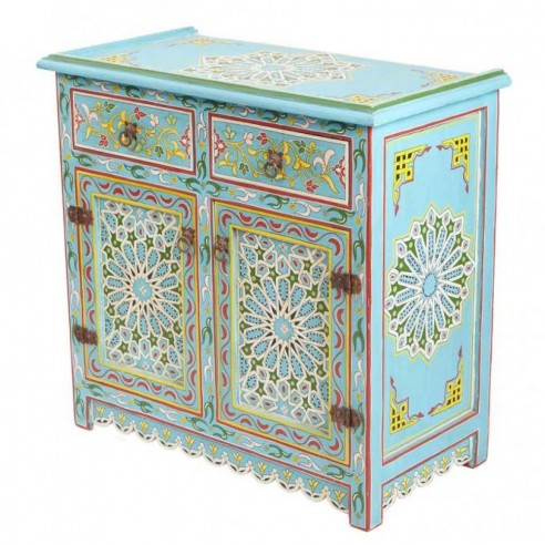Orientalna komoda z Maroka wykonana została z litego cedru i uzupełniona ozdobami z metalu. Komoda zawiera 4 szuflady i 3 drzwiczek.