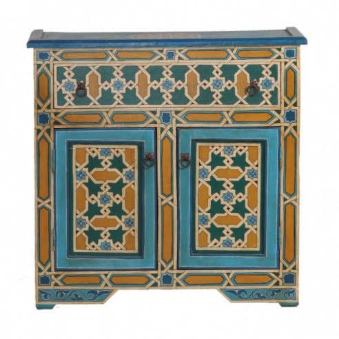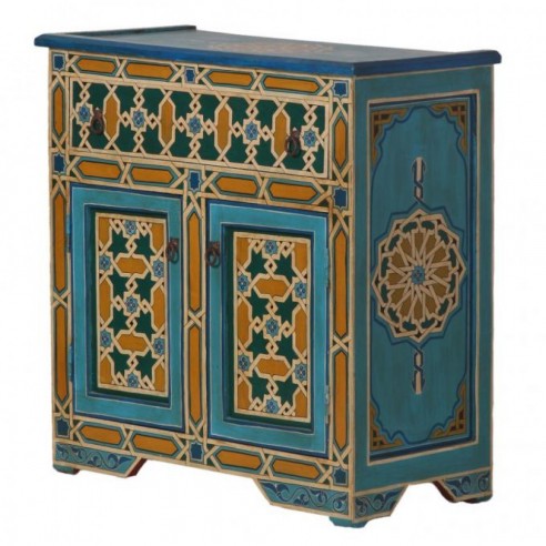 Orientalna komoda z Maroka wykonana została z litego cedru i uzupełniona ozdobami z metalu. Komoda zawiera 4 szuflady i 3 drzwiczek.