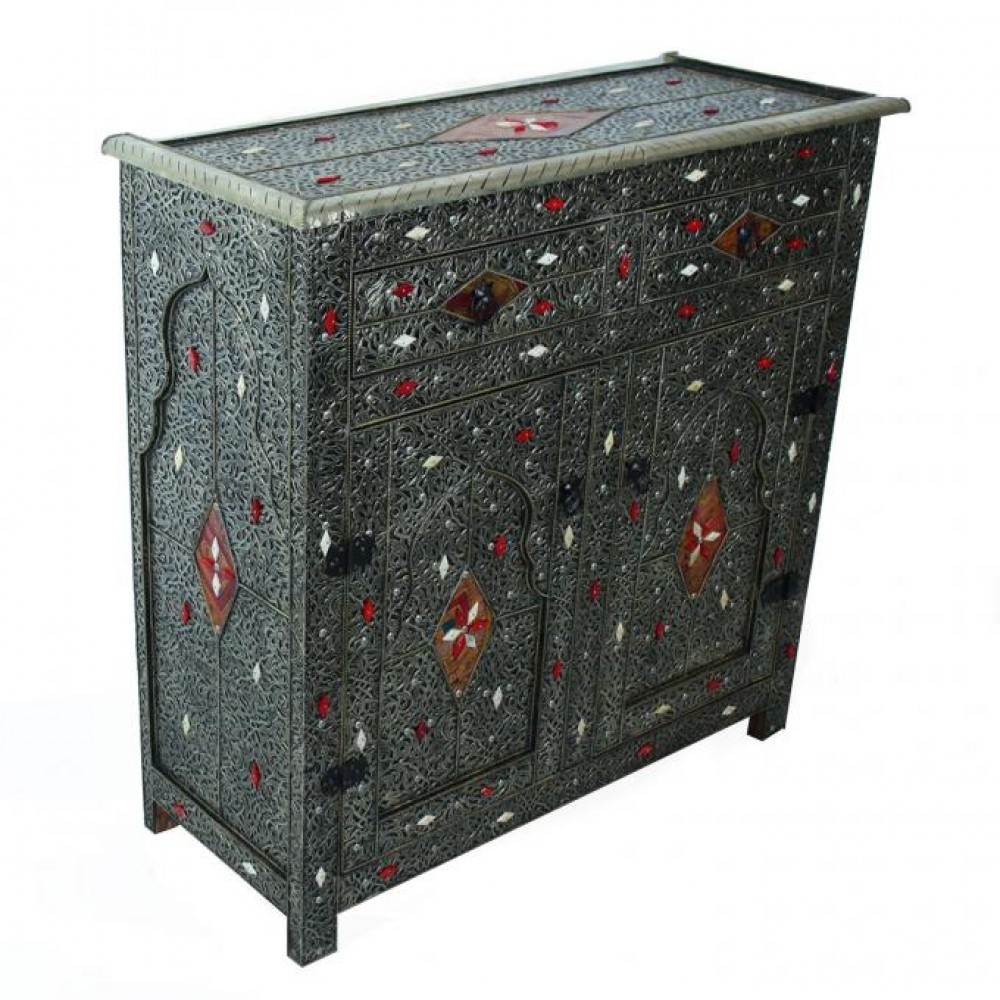 Orientalna komoda z Maroka wykonana została z litego cedru i uzupełniona ozdobami z metalu. Komoda zawiera 4 szuflady i 3 drzwiczek.