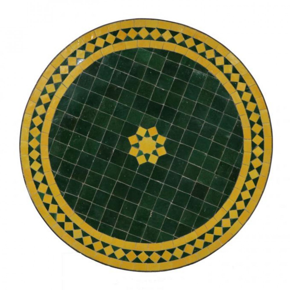 Okrągły stolik z Maroka w orientalnym stylu. Ekskluzywne marokańskie rękodzieło. Blat wykonany jest z pojedynczych mozaikowych płytek ZELLIGE, starannie ze sobą połączonych. Całość jest przymocowana do metalowej ramy. Rama zrobiona jest z kutego żelaza i posiada charakterystyczny, szlachetny kolor rdzy. Jej powierzchnia jest zabezpieczona lakierem. Blat z mozaiki z powodu swojej dużej wagi zapewnia stabilność, nie jest wymagany dodatkowy montaż.