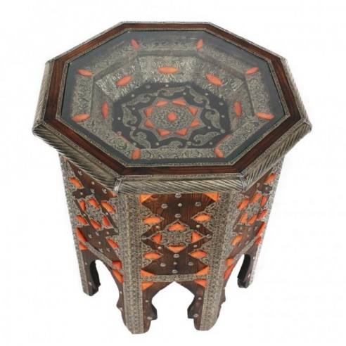 Orientalny stolik TACHAFIN wykonany ręcznie z litego drewna cedrowego. Ozdobiony jest pięknymi metalowymi okuciami, które umieszczone są również pod szklanym blatem.