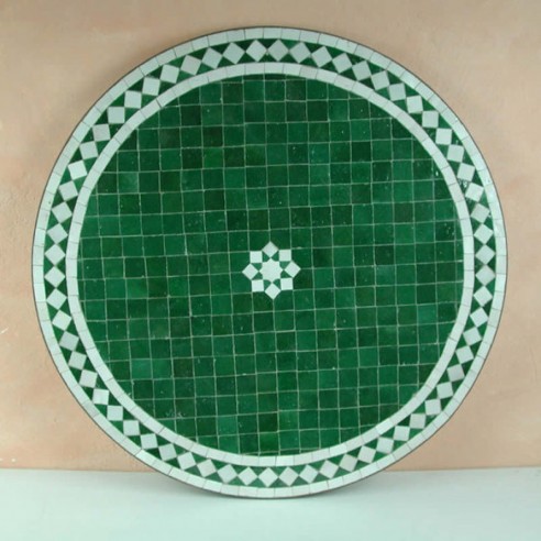 Okrągły stolik z Maroka w orientalnym stylu. Ekskluzywne marokańskie rękodzieło. Blat wykonany jest z pojedynczych mozaikowych płytek ZELLIGE, starannie ze sobą połączonych. Całość jest przymocowana do metalowej ramy. Rama zrobiona jest z kutego żelaza i posiada charakterystyczny, szlachetny kolor rdzy. Jej powierzchnia jest zabezpieczona lakierem. Blat z mozaiki z powodu swojej dużej wagi zapewnia stabilność, nie jest wymagany dodatkowy montaż.