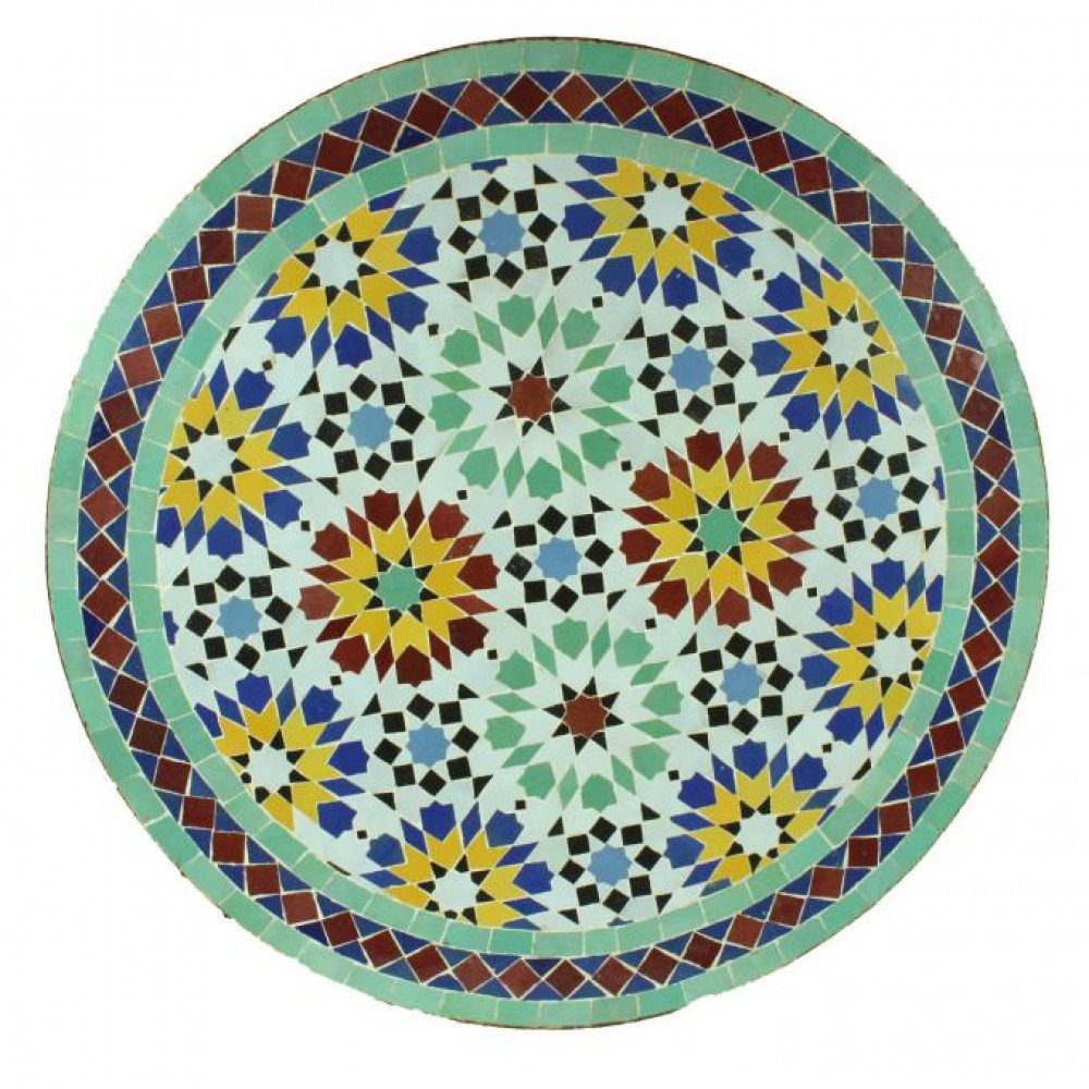 Okrągły stolik z Maroka w orientalnym stylu. Ekskluzywne marokańskie rękodzieło. Blat wykonany jest z pojedynczych mozaikowych płytek ZELLIGE, starannie ze sobą połączonych. Całość jest przymocowana do metalowej ramy. Rama zrobiona jest z kutego żelaza i posiada charakterystyczny, szlachetny kolor rdzy. Jej powierzchnia jest zabezpieczona lakierem. Blat z mozaiki z powodu swojej dużej wagi zapewnia stabilność, nie jest wymagany dodatkowy montaż.