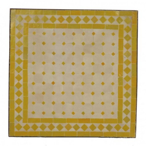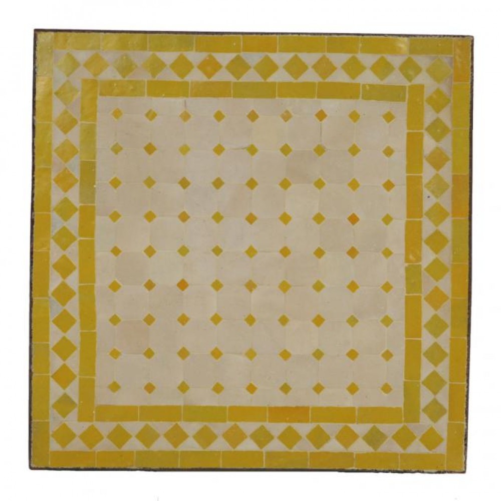 Kwadratowy stolik z Maroka w orientalnym stylu. Ekskluzywne marokańskie rękodzieło. Blat wykonany jest z pojedynczych mozaikowych płytek ZELLIGE, starannie ze sobą połączonych. Całość jest przymocowana do metalowej ramy. Rama zrobiona jest z kutego żelaza i posiada charakterystyczny, szlachetny kolor rdzy. Jej powierzchnia jest zabezpieczona lakierem. Blat z mozaiki z powodu swojej dużej wagi zapewnia stabilność, nie jest wymagany dodatkowy montaż.