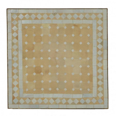 Kwadratowy stolik z Maroka w orientalnym stylu. Ekskluzywne marokańskie rękodzieło. Blat wykonany jest z pojedynczych mozaikowych płytek ZELLIGE, starannie ze sobą połączonych. Całość jest przymocowana do metalowej ramy. Rama zrobiona jest z kutego żelaza i posiada charakterystyczny, szlachetny kolor rdzy. Jej powierzchnia jest zabezpieczona lakierem. Blat z mozaiki z powodu swojej dużej wagi zapewnia stabilność, nie jest wymagany dodatkowy montaż.