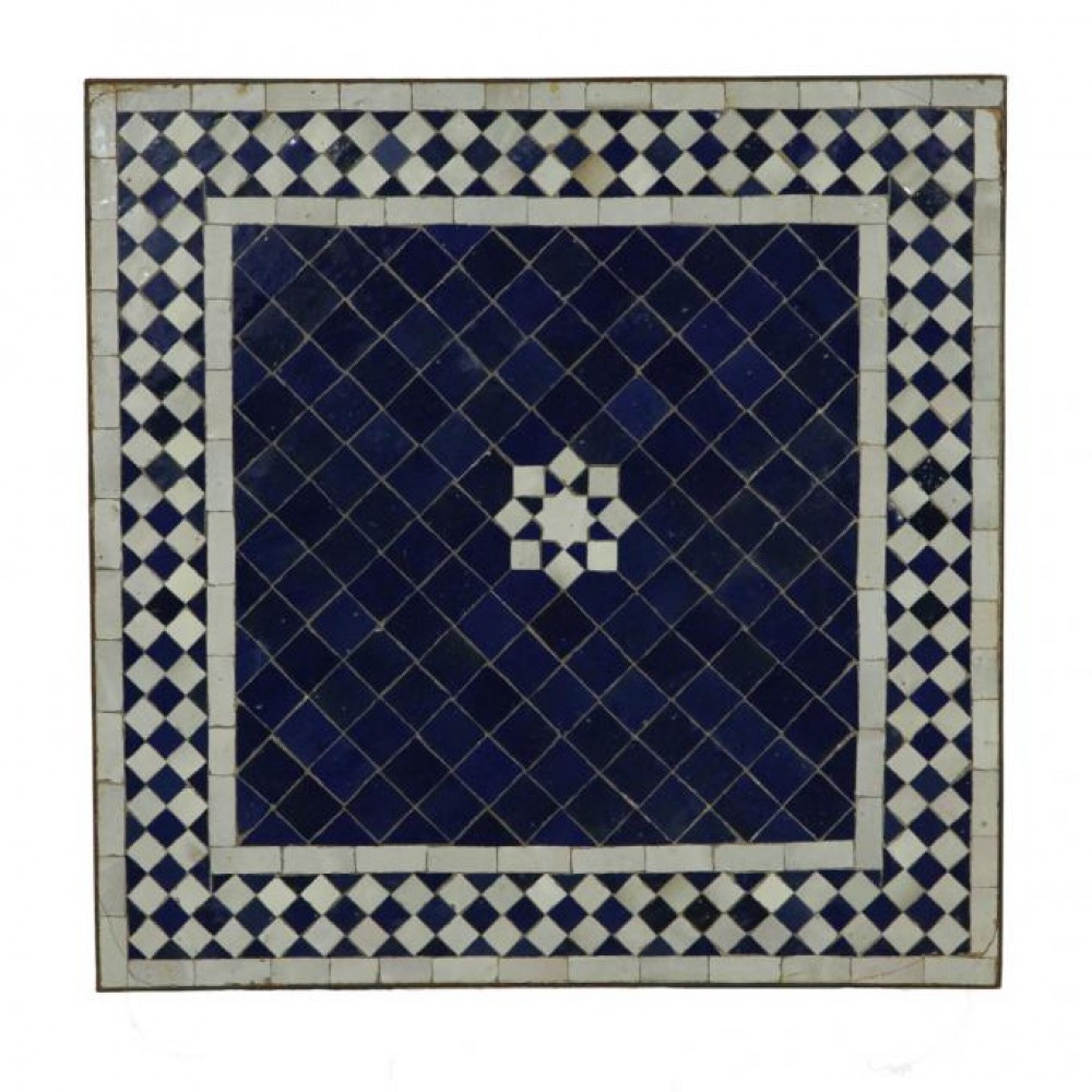Kwadratowy stolik z Maroka w orientalnym stylu. Ekskluzywne marokańskie rękodzieło. Blat wykonany jest z pojedynczych mozaikowych płytek ZELLIGE, starannie ze sobą połączonych. Całość jest przymocowana do metalowej ramy. Rama zrobiona jest z kutego żelaza i posiada charakterystyczny, szlachetny kolor rdzy. Jej powierzchnia jest zabezpieczona lakierem. Blat z mozaiki z powodu swojej dużej wagi zapewnia stabilność, nie jest wymagany dodatkowy montaż.