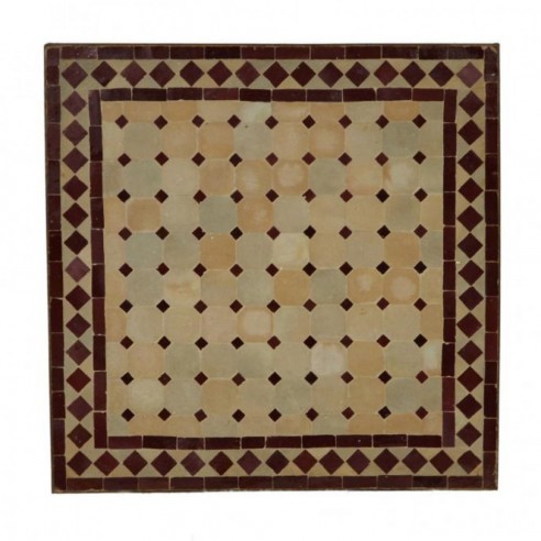 Kwadratowy stolik z Maroka w orientalnym stylu. Ekskluzywne marokańskie rękodzieło. Blat wykonany jest z pojedynczych mozaikowych płytek ZELLIGE, starannie ze sobą połączonych. Całość jest przymocowana do metalowej ramy. Rama zrobiona jest z kutego żelaza i posiada charakterystyczny, szlachetny kolor rdzy. Jej powierzchnia jest zabezpieczona lakierem. Blat z mozaiki z powodu swojej dużej wagi zapewnia stabilność, nie jest wymagany dodatkowy montaż.