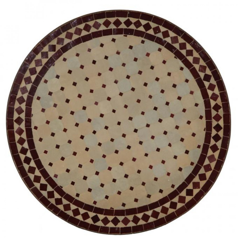 Okrągły stolik z Maroka w orientalnym stylu. Ekskluzywne marokańskie rękodzieło. Blat wykonany jest z pojedynczych mozaikowych płytek ZELLIGE, starannie ze sobą połączonych. Całość jest przymocowana do metalowej ramy. Rama zrobiona jest z kutego żelaza i posiada charakterystyczny, szlachetny kolor rdzy. Jej powierzchnia jest zabezpieczona lakierem. Blat z mozaiki z powodu swojej dużej wagi zapewnia stabilność, nie jest wymagany dodatkowy montaż.