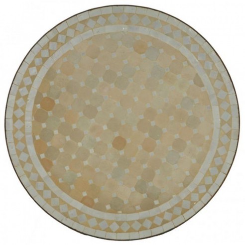 Okrągły stolik z Maroka w orientalnym stylu. Ekskluzywne marokańskie rękodzieło. Blat wykonany jest z pojedynczych mozaikowych płytek ZELLIGE, starannie ze sobą połączonych. Całość jest przymocowana do metalowej ramy. Rama zrobiona jest z kutego żelaza i posiada charakterystyczny, szlachetny kolor rdzy. Jej powierzchnia jest zabezpieczona lakierem. Blat z mozaiki z powodu swojej dużej wagi zapewnia stabilność, nie jest wymagany dodatkowy montaż.