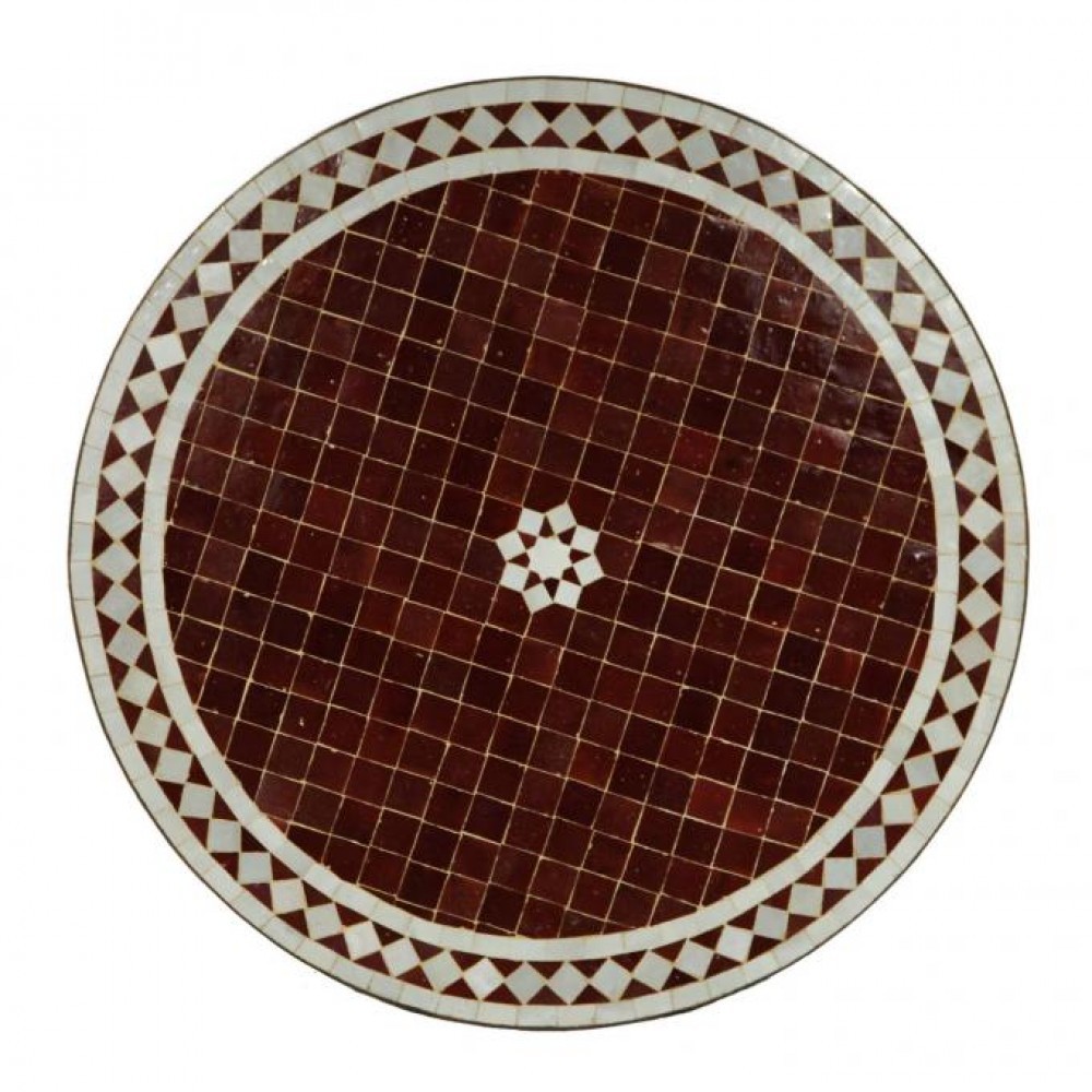 Okrągły stolik z Maroka w orientalnym stylu. Ekskluzywne marokańskie rękodzieło. Blat wykonany jest z pojedynczych mozaikowych płytek ZELLIGE, starannie ze sobą połączonych. Całość jest przymocowana do metalowej ramy. Rama zrobiona jest z kutego żelaza i posiada charakterystyczny, szlachetny kolor rdzy. Jej powierzchnia jest zabezpieczona lakierem. Blat z mozaiki z powodu swojej dużej wagi zapewnia stabilność, nie jest wymagany dodatkowy montaż.