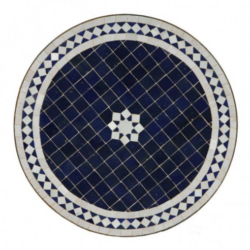 Okrągły stolik z Maroka w orientalnym stylu. Ekskluzywne marokańskie rękodzieło. Blat wykonany jest z pojedynczych mozaikowych płytek ZELLIGE, starannie ze sobą połączonych. Całość jest przymocowana do metalowej ramy. Rama zrobiona jest z kutego żelaza i posiada charakterystyczny, szlachetny kolor rdzy. Jej powierzchnia jest zabezpieczona lakierem. Blat z mozaiki z powodu swojej dużej wagi zapewnia stabilność, nie jest wymagany dodatkowy montaż.