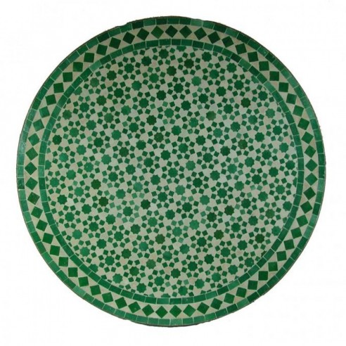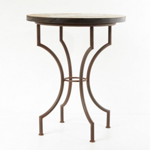 Okrągły stolik z Maroka w orientalnym stylu. Ekskluzywne marokańskie rękodzieło. Blat wykonany jest z pojedynczych mozaikowych płytek ZELLIGE, starannie ze sobą połączonych. Całość jest przymocowana do metalowej ramy. Rama zrobiona jest z kutego żelaza i posiada charakterystyczny, szlachetny kolor rdzy. Jej powierzchnia jest zabezpieczona lakierem. Blat z mozaiki z powodu swojej dużej wagi zapewnia stabilność, nie jest wymagany dodatkowy montaż.