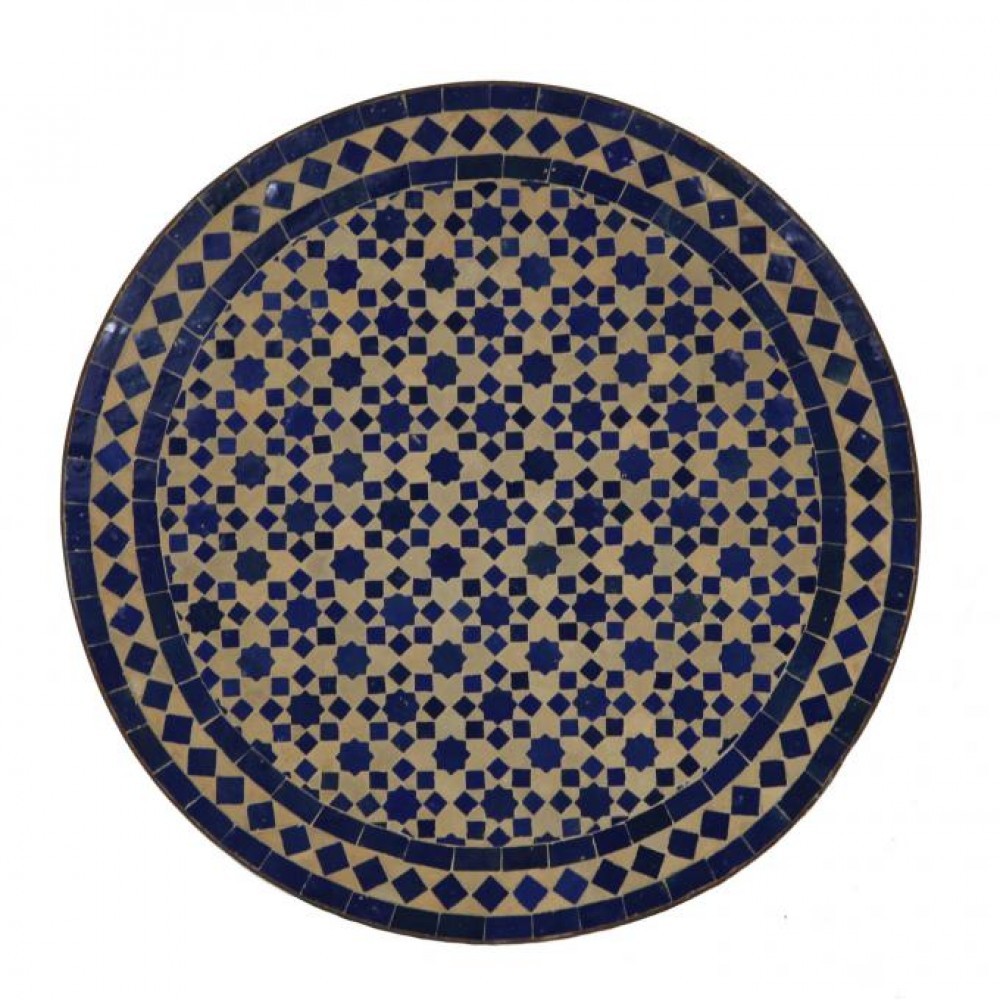 Okrągły stolik z Maroka w orientalnym stylu. Ekskluzywne marokańskie rękodzieło. Blat wykonany jest z pojedynczych mozaikowych płytek ZELLIGE, starannie ze sobą połączonych. Całość jest przymocowana do metalowej ramy. Rama zrobiona jest z kutego żelaza i posiada charakterystyczny, szlachetny kolor rdzy. Jej powierzchnia jest zabezpieczona lakierem. Blat z mozaiki z powodu swojej dużej wagi zapewnia stabilność, nie jest wymagany dodatkowy montaż.