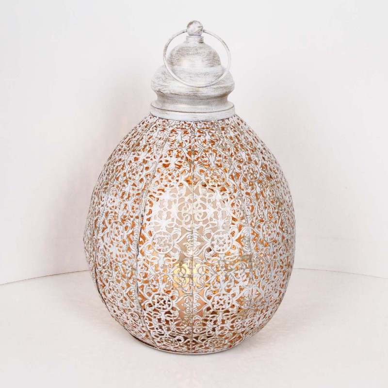 Ten orientalny świecznik jest wykonany ręcznie. Świecznik jest pomalowany na złoto od wewnątrz i shabby chic na biało od zewnątrz. Wewnątrz znajduje się wbudowany kubek na świeczkę tea light. Czy to na tarasie, w domu, czy w ogrodzie, lampion ten tworzy bardzo piękną orientalną atmosferę.