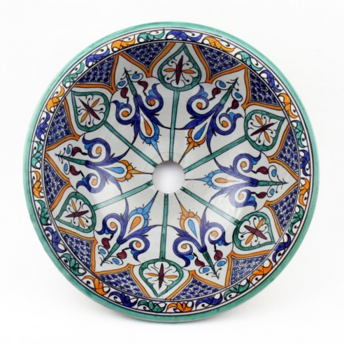 Nablatowa umywlka ceramiczna wykonana ręcznie przez rzemieślników z Maroka. Piękne arabskie wzory i kolory sprawdzą się zarówno w łazienkach klasycznych i nowoczesnych. Z powodu sposobu wytwarzania umywalki mogą nieznacznie różnić się od tych pokazanych na zdjęciu - każdy egzemplarz jest unikatowy. Mogą pojawić się również nieznaczne różnice wymiarowe. Oferowane umywalki są wysokiej jakości - są odporne na wszelkie czynniki występujące w typowej eksploatacji. Umywalki mogą być stosowane jako nablatowe, albo jako wpuszczane w blat.