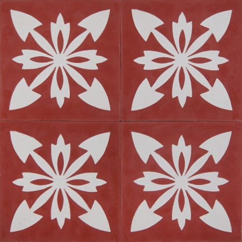 Biało-czerwone płytki cementowe 206 z geometryczno-roślinnym wzorem. Te wykonane w Maroku kafle są świetnym wyborem dla Twoich wnętrz! Kolory płytki: biały (M01), czerwony (M59). Opakowanie: 12 szt (0,48 m2). Format płytki 200x200x16 mm.